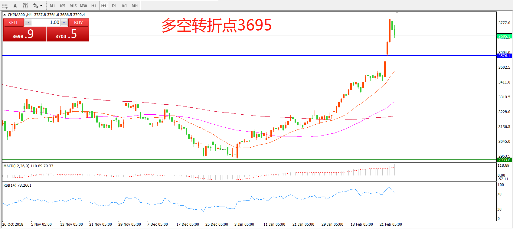 4小时图看,CHINA300中华指数突破阻力后强势上行,触及上方3800一线出现回落,大整依然处于上升趋势,均线系统呈多头排列, MACD红柱增加,RSI有掉头迹象,整体维持偏多思路。