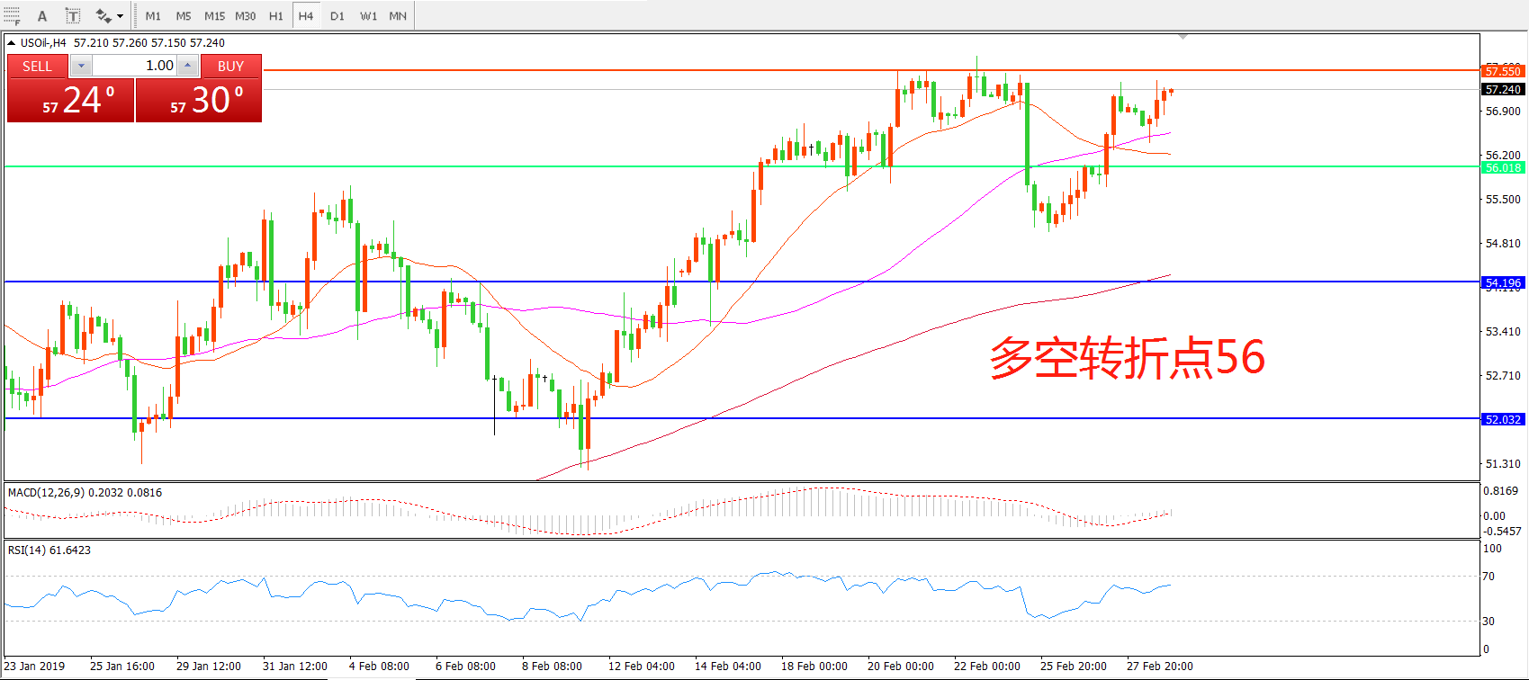 4小时图看,油价昨日明显反弹,收盘后再次站上55周期均线,57.5一线是阻挡油价上行的重要阻力,重点关注。短期均线有拐头迹象,MACD绿柱减少,RSI拐头向上,日内窄幅震荡概率较大。