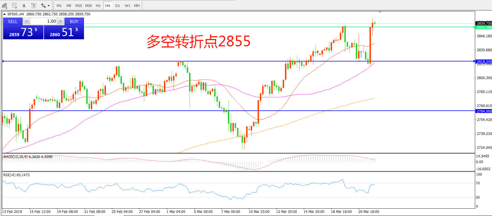 4小时图看,标普500在触碰2818支撑后强势反弹, 均线系统呈多头排列,MACD红柱减少,RSI指标掉头向下,日内依然有下行压力,重点关注2855一线支撑。