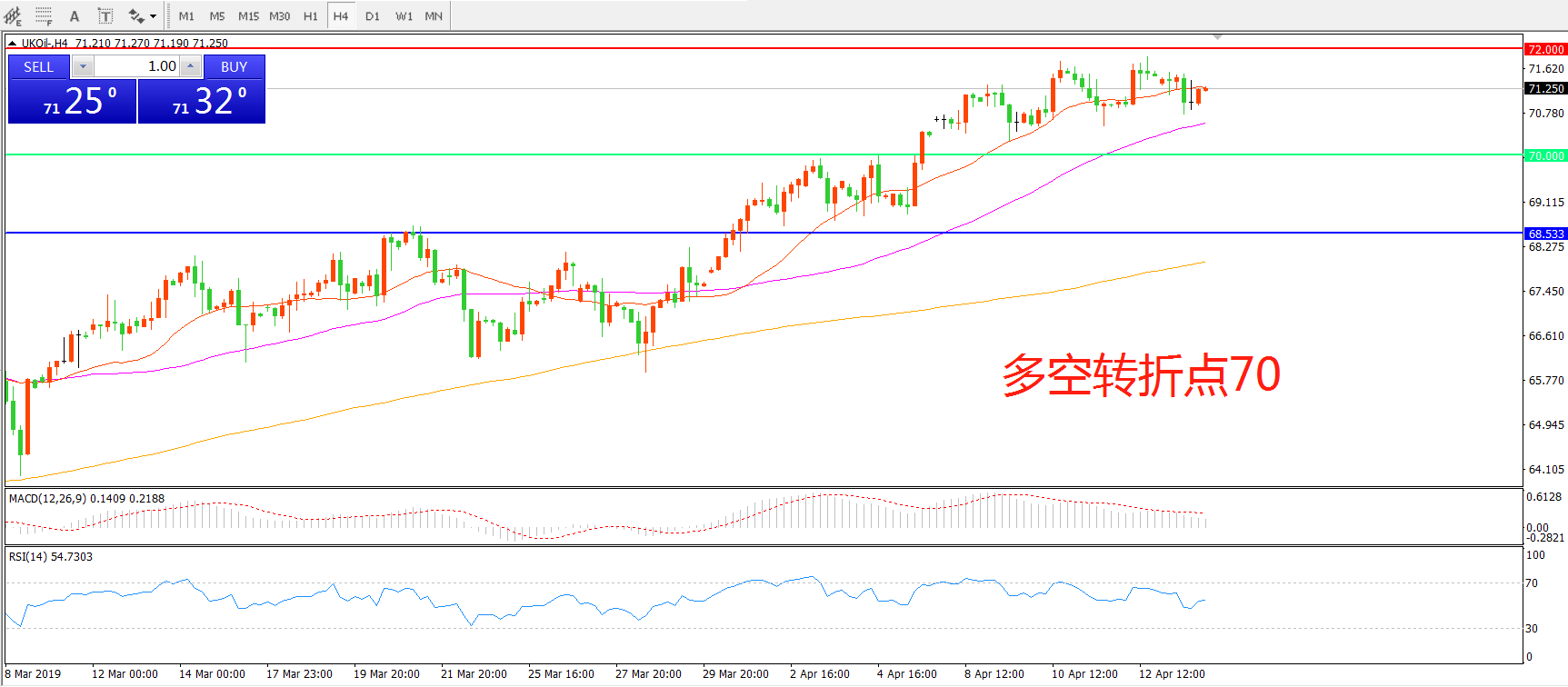 4小时图看,油价触碰上方72阻力后震荡下行,调整迹象明显,均线系统依然呈多头排列,55周期均线成为短期支撑,MACD红柱减少,RSI指标罐头,日内依然以震荡思路对待。