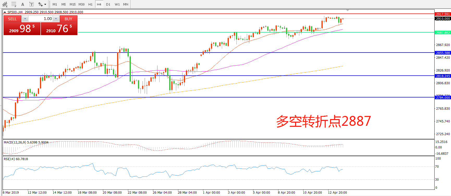 4小时图看,标普500以21均线为支撑震荡上行,短期受制于2917一线,但整体走势依然强势,MACD走平,RSI指标向上,日内依然维持多头思路。