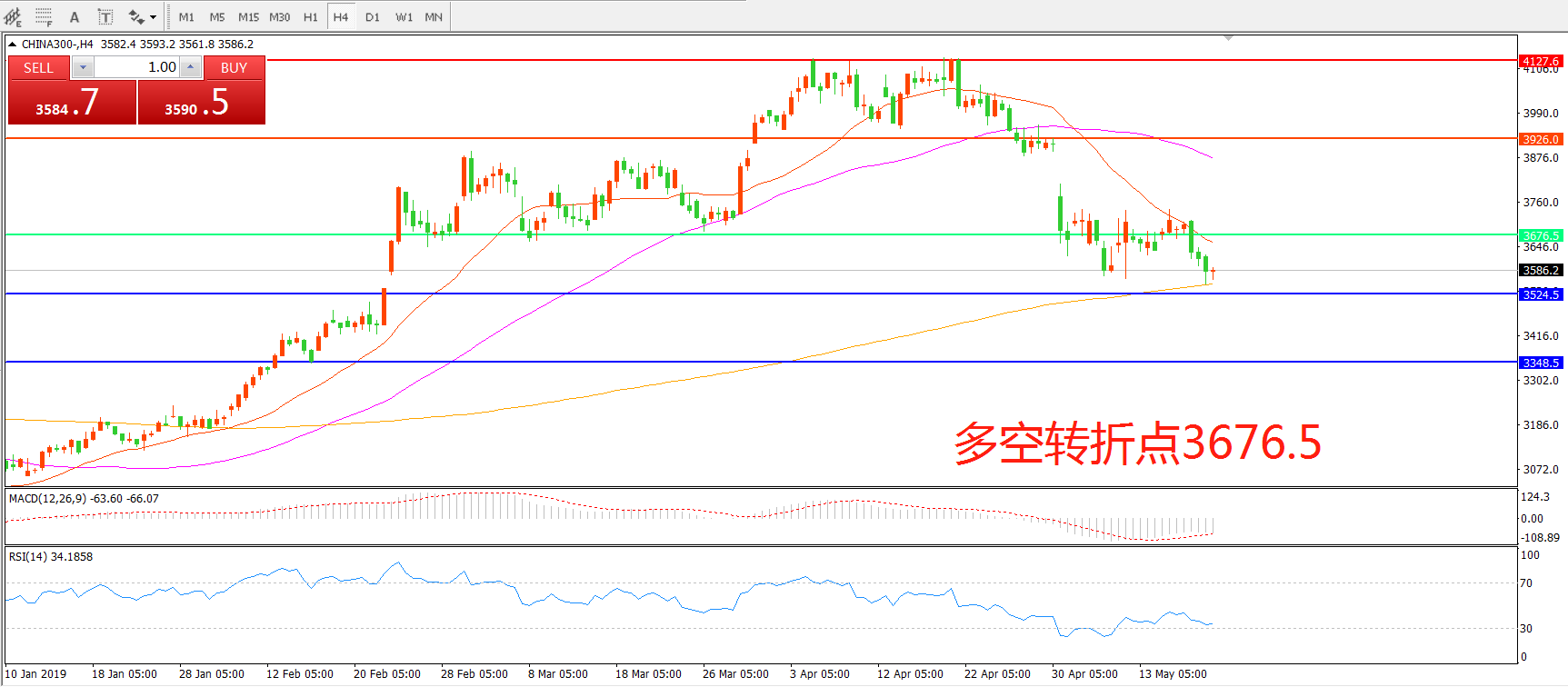 4小时图看,沪深300指数在3676.5整理后震荡下行, 短期走势偏空,200均线逐成为下方支撑,MACD绿柱缩短,RSI指标拐头向下,日内以震荡下行思路对待。