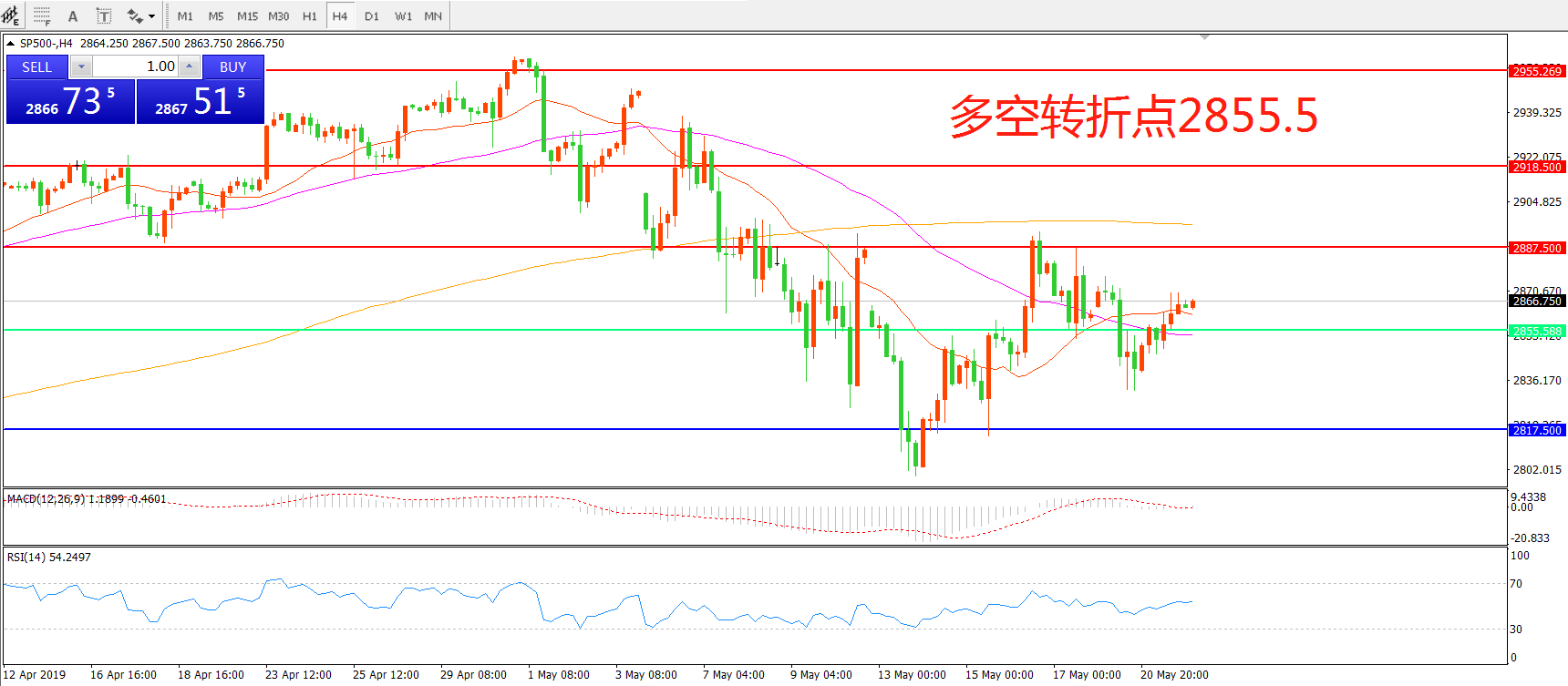 4小时图看,标普500阳整体呈现三角形整理形态,价格连续反弹站上2855.5一线,短期均线逐渐走平, MACD红柱增加,日内预计以震荡形态为主。