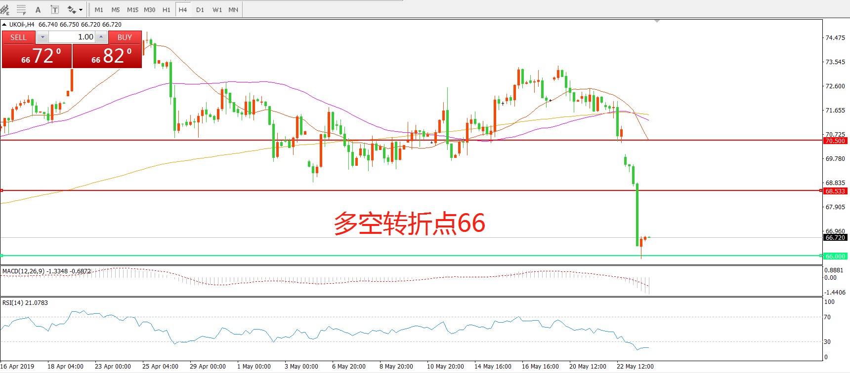 4小时图看,油价长阴下行,跌破前期整理区间,整体走势疲软,短期均线拐头向下, MACD绿柱增加,RSI走平,日内有小幅反弹机会,但整体走势偏空,切忌逆势追多。