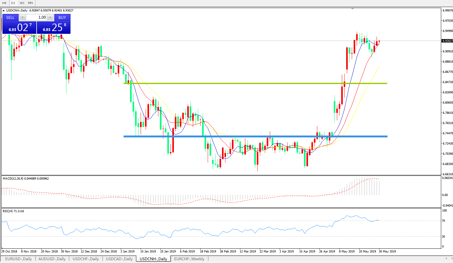技术面简析:日线均线整体维持攻势MACD0轴上方运行但动能柱轻微缩量RSI超买区域附近运行,汇价强力上攻后宽幅强势整理,预计短期汇价有下行回踩需求,中期重点关注中美贸易争端后续进展
