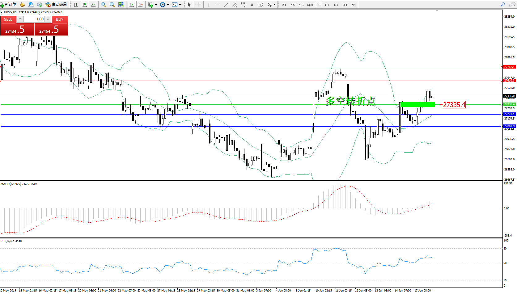 香港恒生指数6月18日(周二)收盘上涨271.61点,涨幅1.00%,报27498.77点;中国和美国将在本月晚些时候举行的20国集团(G20)峰会之前重启贸易谈判,这激起了人们对两国将解决难以平息的贸易战的希望。利好消息暂时匮乏之下,市况表现牛皮,消息股炒作持续,本地地产股持续有资金流入,特别是跟随大市调整之时,料市场仍看好本地地产行业稳定发展,本周市场将续以炒作美国减息为主流。