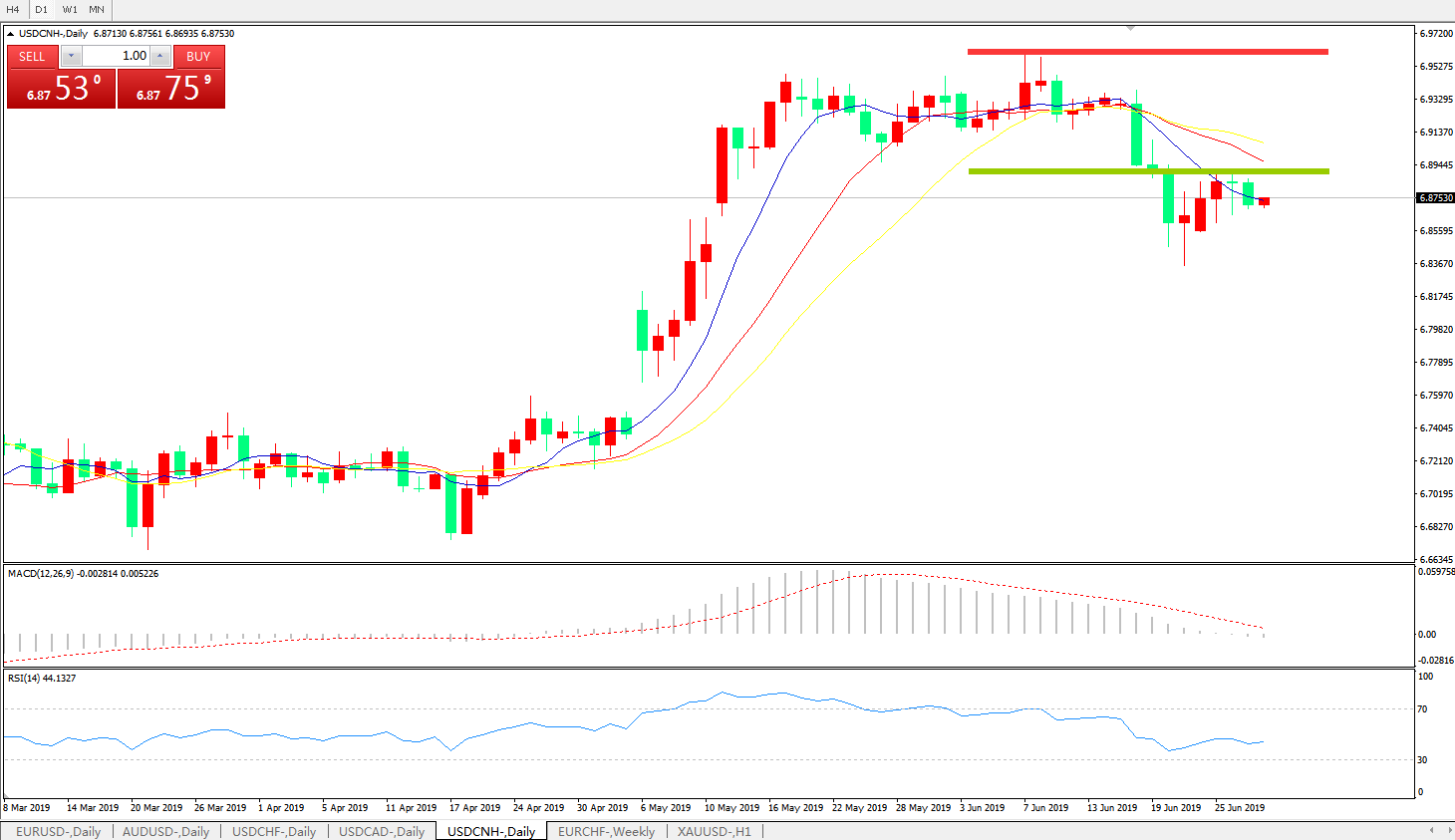 技术面简析:日线图呈有序空头排列,MACD逼近0轴且动能柱绿柱放量,RS延续弱势,贸易争端缓解预期犹在,G20进行时谨慎关注,预计汇价大概率将进一步走低。