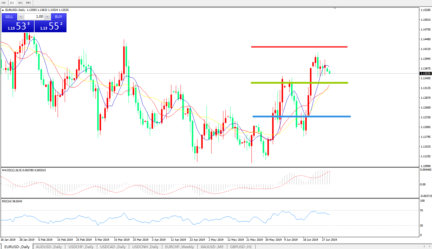 周五(6月28日)欧洲时段,欧元兑美元走高0.1%至1.1380,此前法国与欧元区通胀数据意外走强,且投资者在G20会议期间立场观望,令美元指数承压回落,另一方面,欧元区未季调核心CPI年率好于预期,减小了欧洲央行在此后的宽松压力,这也使得大家对欧洲央行加速宽松的预期降温。而欧元兑美元货币对的后继走势仍取决于美欧央行在宽松货币政策竞赛中的步伐,因此,下周集中出炉的欧美PMI数据,连同美国6月非农报告,将决定汇价的下一步走势方向。更多可能促进美联储超预期降息的经济负面新闻将推动欧元兑美元真正站上1.14关口。