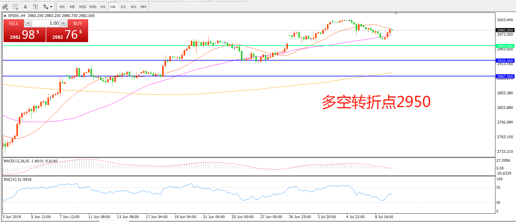 4小时图看,标普站稳2950后震荡上行,跌破 55周期均线后再次反弹,短期走势依然偏向震荡,MACD红柱缩短,RSI指标拐头向下,日内延续震荡概率较大。