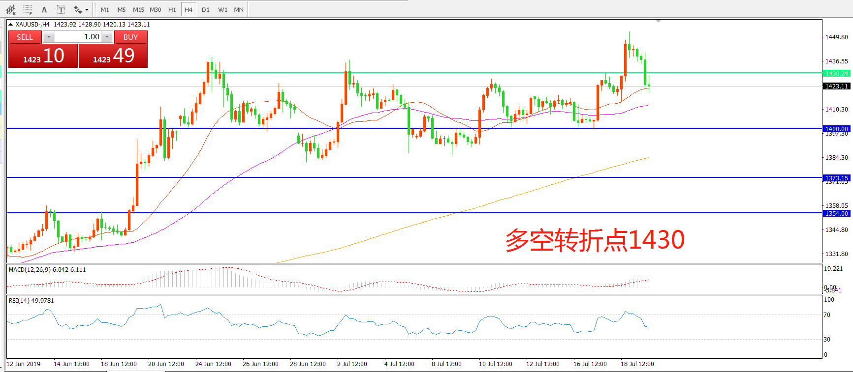 4小时图看,金价整体呈现冲高回落形态,触碰1452.8高点后大幅回落,未能站稳1430关口,但依然站在短期均线系统之上,MACD红柱缩短,RSI指标走平,中期走势依然偏多。