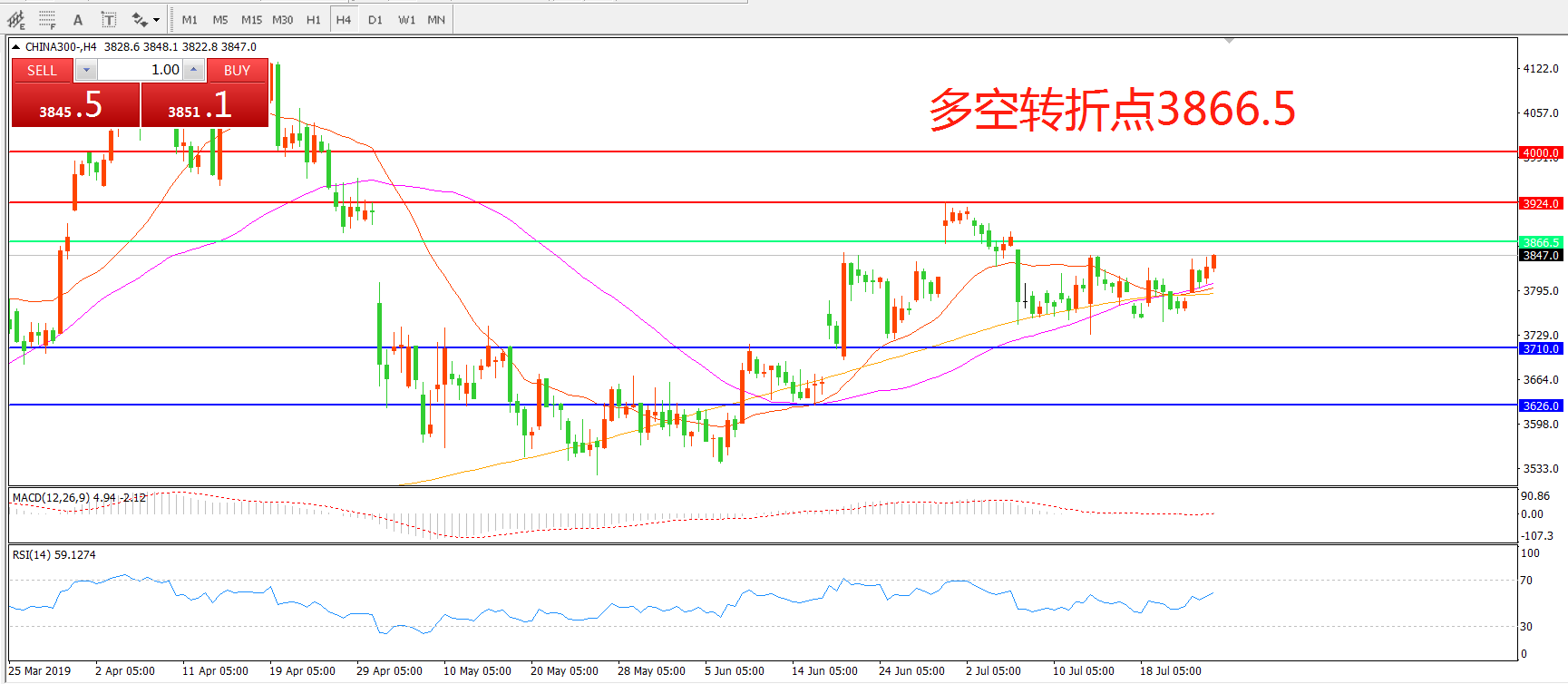 4小时图看,沪深300指数延续震荡,均线系统粘合形成支撑,MACD红柱缩短,RSI指标向上,日内重点关注3866.5一线得失。