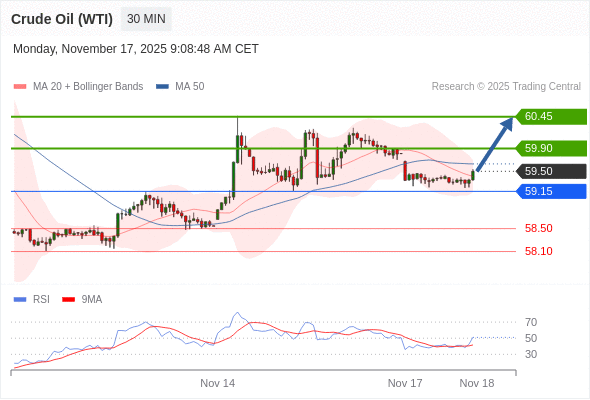 在 59.15 之上,看涨,目标价位为 59.90 ,然后为 60.45 。