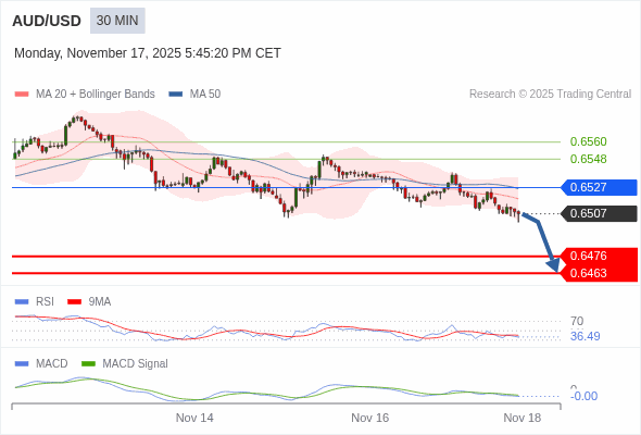 澳元/美元 当日内 : 看跌,在 0.6527 之下。