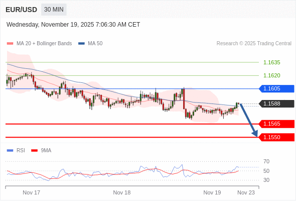 在 1.1605 之下,看跌,目标价位为 1.1565 ,然后为 1.1550 。