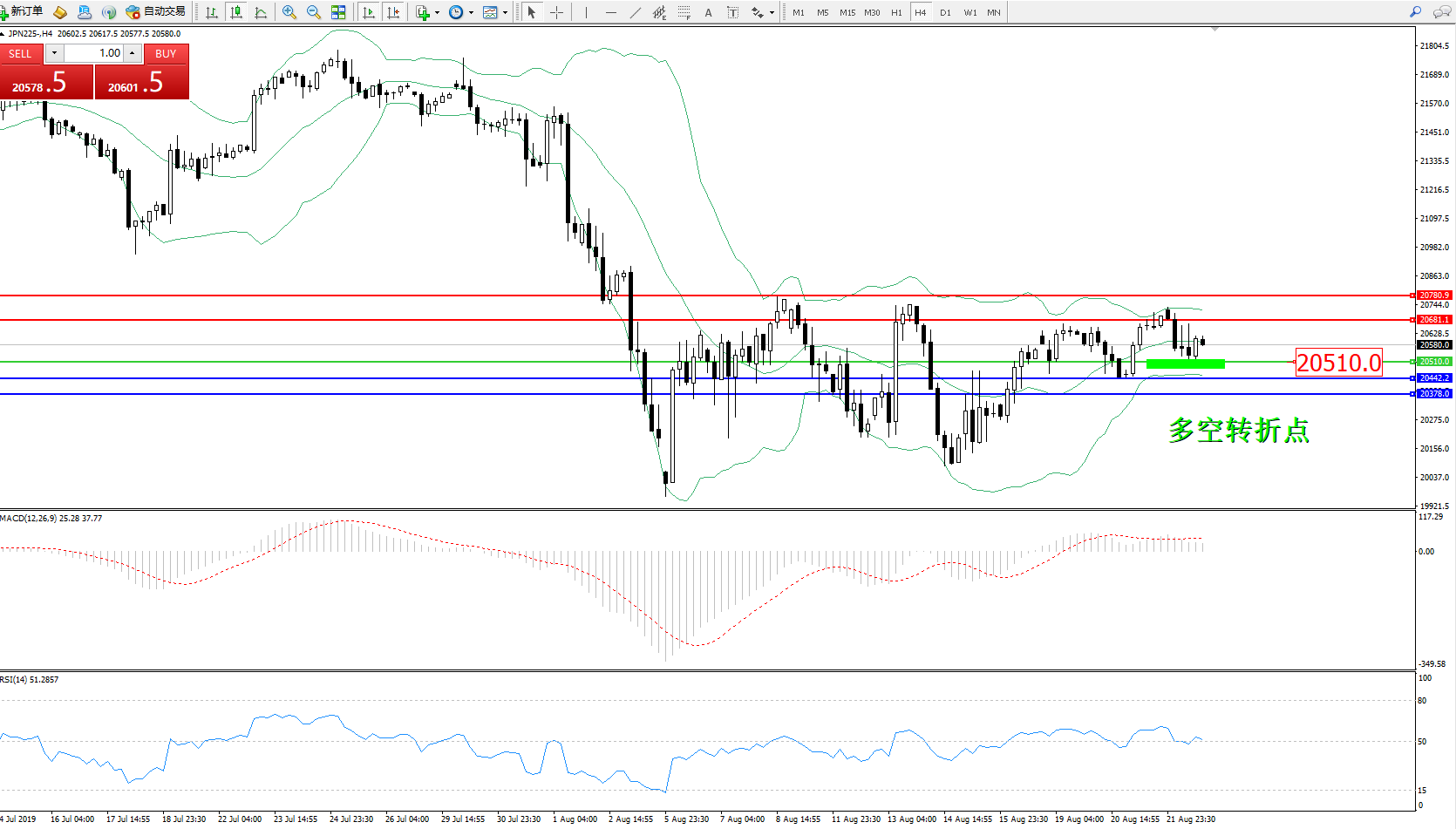 日经225指数8月22日(周四)收盘下跌4.57点,跌幅0.02%,报20614.00点。商业调查显示,日本8月制造业活动连续第四个月萎缩,因出口订单下滑步伐加大。但日本服务业活动扩张速度为将近两年来最高,暗示国内需求强韧,继续在抵消日本经济受到的一些外部强大压力;经季节调整的8月Jibun银行制造业采购经理人指数(PMI)初值微升至49.5,高于前月终值49.4,但仍连续第四个月低于50的荣枯分水岭。 制造业产出和整体新订单再度呈现萎缩,不过萎缩程度较7月略为温和;PMI报告的其他重要活动指标则表现错综。就业扩张,企业未交货订单指标升至八个月高点,但仍处于萎缩区域;另一份调查显示日本服务业活动扩张,帮助提振了综合PMI指数。