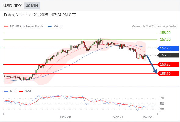 交易策略: 在 157.25 之下,看跌,目标价位为 156.25 ,然后为 155.70 。