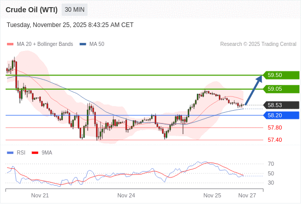 在 58.20 之上,看涨,目标价位为 59.05 ,然后为 59.50 。