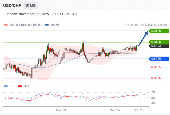 在 0.8070 之上,看涨,目标价位为 0.8100 ,然后为 0.8120 。