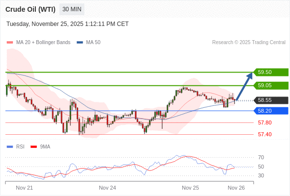 在 58.20 之上,看涨,目标价位为 59.05 ,然后为 59.50 。