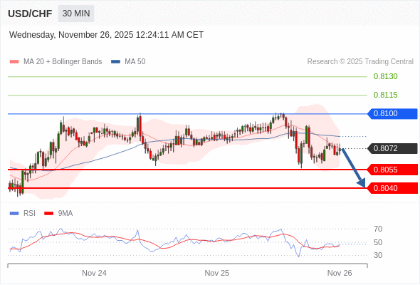 在 0.8100 之下,看跌,目标价位为 0.8055 ,然后为 0.8040 。