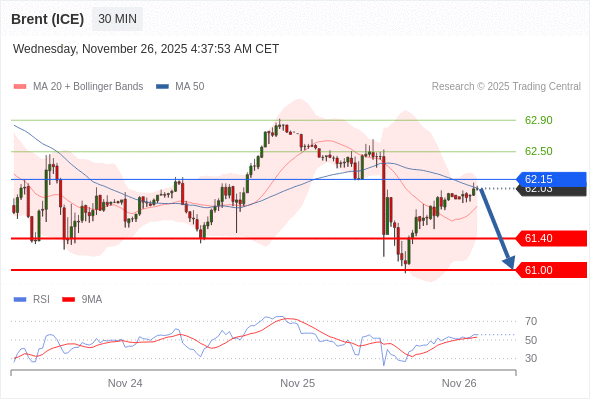 在 62.15 之下,看跌,目标价位为 61.40 ,然后为 61.00 。