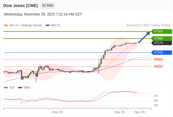 在 47000 之上,看涨,目标价位为 47400 ,然后为 47600 。