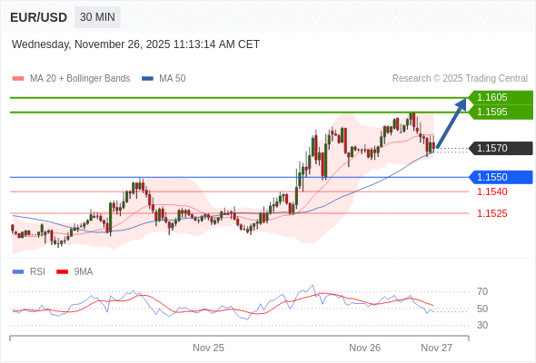 在 1.1550 之上,看涨,目标价位为 1.1595 ,然后为 1.1605 。
