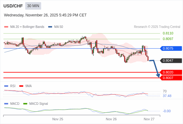 美元/瑞郎 当日内 : 看跌,在 0.8075 之下。