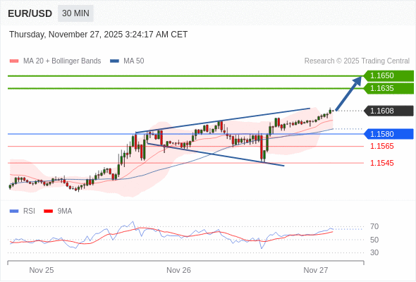 在 1.1580 之上,看涨,目标价位为 1.1635 ,然后为 1.1650 。