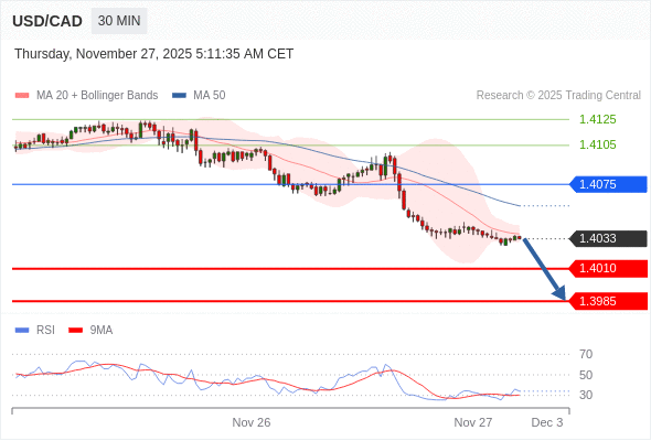 在 1.4075 之下,看跌,目标价位为 1.4010 ,然后为 1.3985 。
