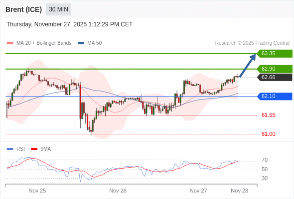 在 62.10 之上,看涨,目标价位为 62.90 ,然后为 63.35 。