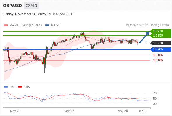 在 1.3205 之上,看涨,目标价位为 1.3255 ,然后为 1.3270 。