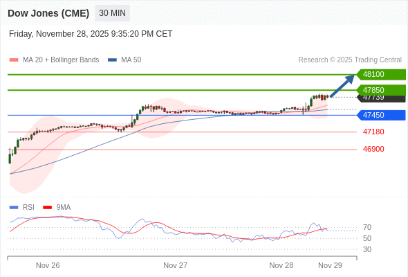 在 47450 之上,看涨,目标价位为 47850 ,然后为 48100 。