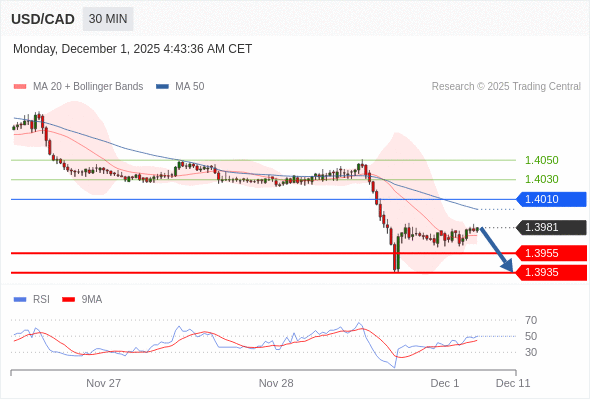 在 1.4010 之下,看跌,目标价位为 1.3955 ,然后为 1.3935 。