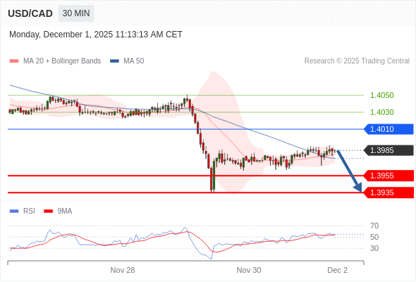 在 1.4010 之下,看跌,目标价位为 1.3955 ,然后为 1.3935 。
