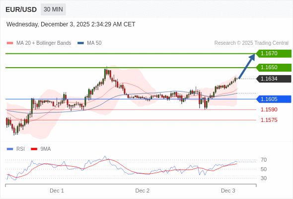 在 1.1605 之上,看涨,目标价位为 1.1650 ,然后为 1.1670 。