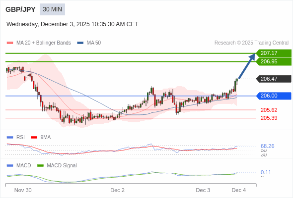 英镑/日元 当日内 : 看涨,当 206.00 为支撑位。