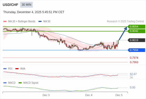 美元/瑞郎 当日内 : 看涨,当 0.7994 为支撑位。