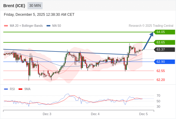 在 62.90 之上,看涨,目标价位为 63.65 ,然后为 64.05 。