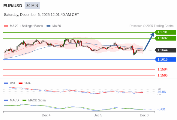技术点评: RSI技术指标小于中性区域50。 MACD技术指标处在其信号线之上看空。 混合配置。 此外,价位低于其20天及50天移动平均线 ( 分别位于1.1645 和1.1649 )。