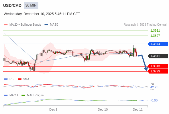 美元/加元 当日内 : 看跌,在 1.3874 之下。