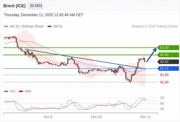 在 62.15 之上,看涨,目标价位为 62.90 ,然后为 63.30 。