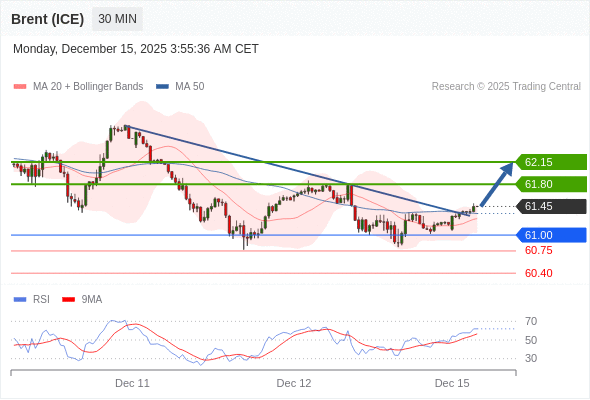 在 61.00 之上,看涨,目标价位为 61.80 ,然后为 62.15 。