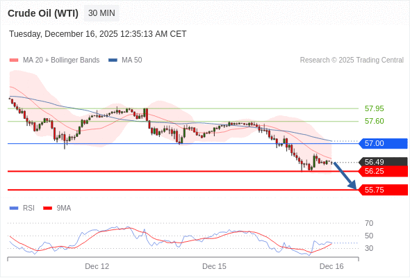 交易策略: 在 57.00 之下,看跌,目标价位为 56.25 ,然后为 55.75 。