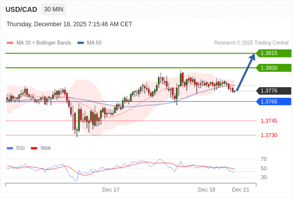 在 1.3765 之上,看涨,目标价位为 1.3800 ,然后为 1.3815 。