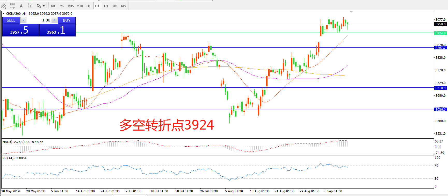 4小时图看,沪深300维持高位震荡形态,整体走势偏强,均线系统呈多头排列,MACD红柱增加,RSI指标走平,日内延续上行概率较大。