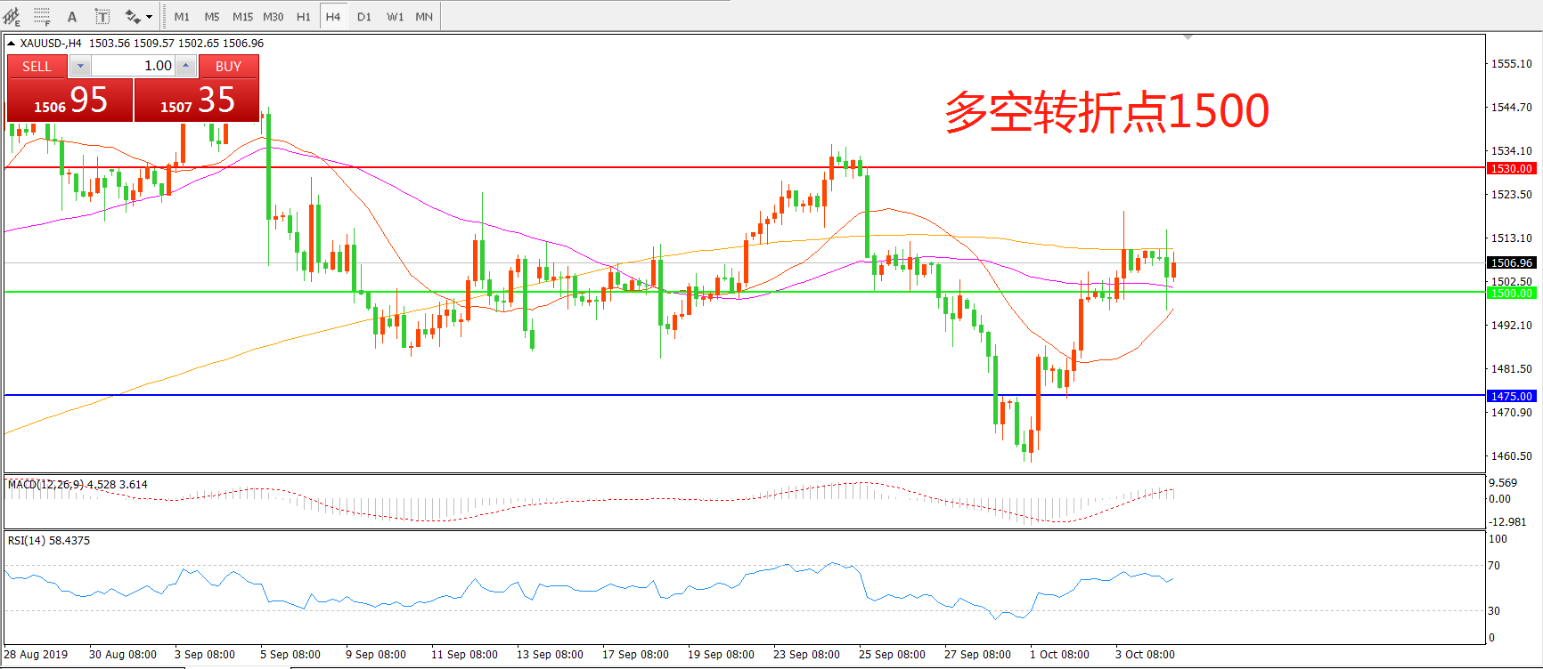 4小时图看,金价大跌后出现反弹,收复千五关口后暂时企稳,短期多空双方将就此进行争夺,MACD红柱增加,RSI指标走平,日内维持震荡概率较大。