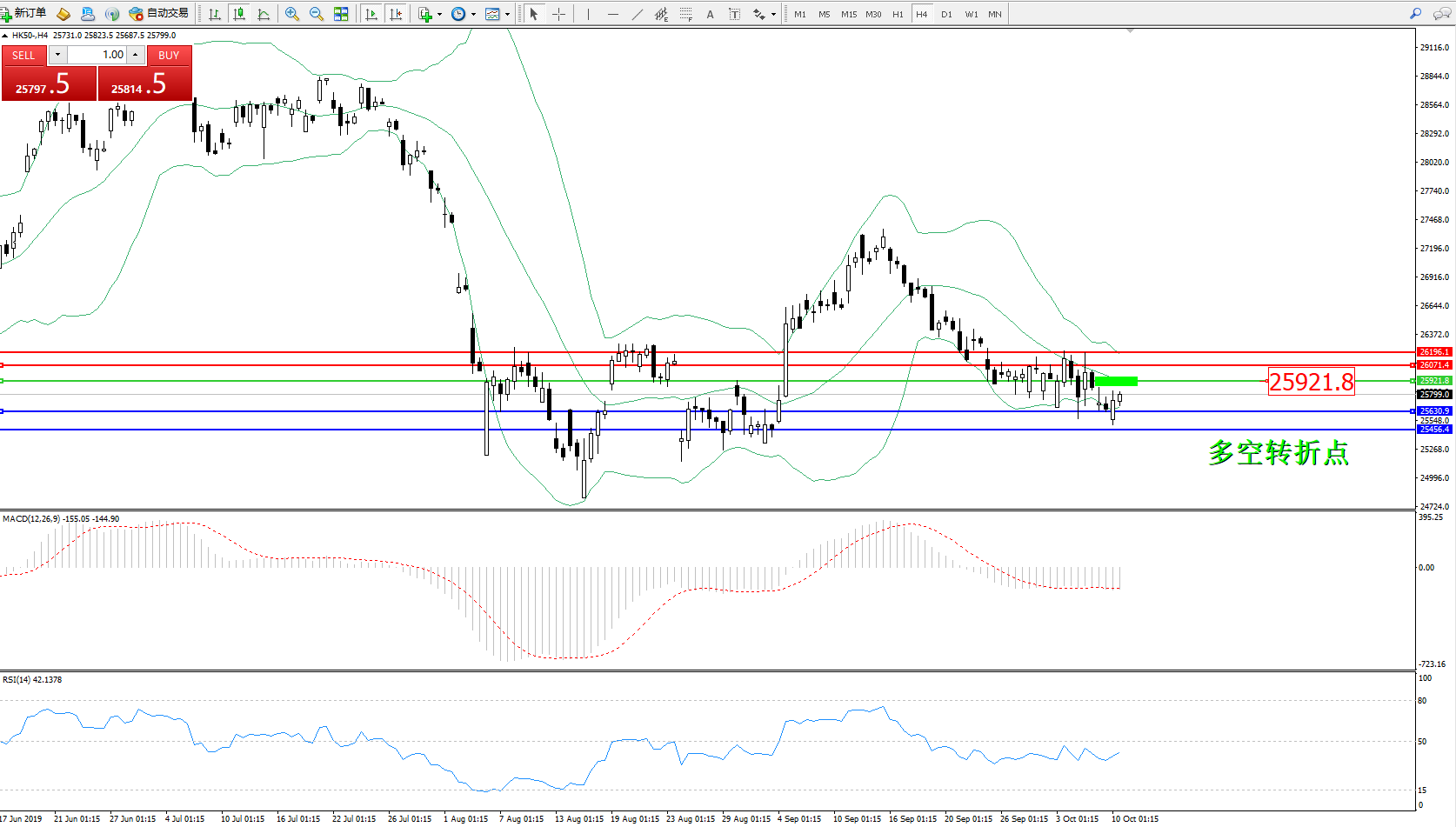 香港恒生指数10月10日(周四)收盘上涨25.12点,涨幅0.10%,报25707.93点;港股小幅低开后向下寻底,恒指最多跌160点,低见25521。随后跟随A股反弹造好,并逐步上25799,。外围环境不断变化,恒指继续维持窄幅震荡。消息面的情况并不是特别乐观,同时市场对贸易局势的担忧,也在一定程度上抑制了恒指向上的步伐。鲍威尔昨日在公开场合演讲,增加市场憧憬月底降息可能,结合来看,市场对恒指走势仍存信心。