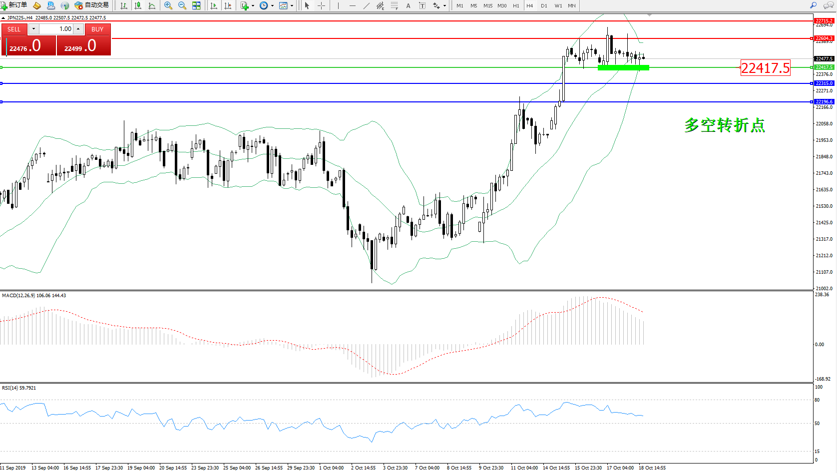 日经225指数10月18日(周五)收盘上涨45.14点,涨幅0.20%,报22497.00点。日本财务大臣麻生太郎:全球经济在接下来一年将继续回温。但地缘政治等风险仍然较高。日本采取了措施来缓和消费税上调带来的效应。当前G20内部没有讨论采取集合行动来应对冲击。日本央行行长黑田东彦认为全球经济增速提高的时间可能延后的观点是正确的。日本经济面临的困难不能单由货币政策来应对,需要财政政策的配合。当日本需要经济支撑的时候,准备好灵活运用财政措施。