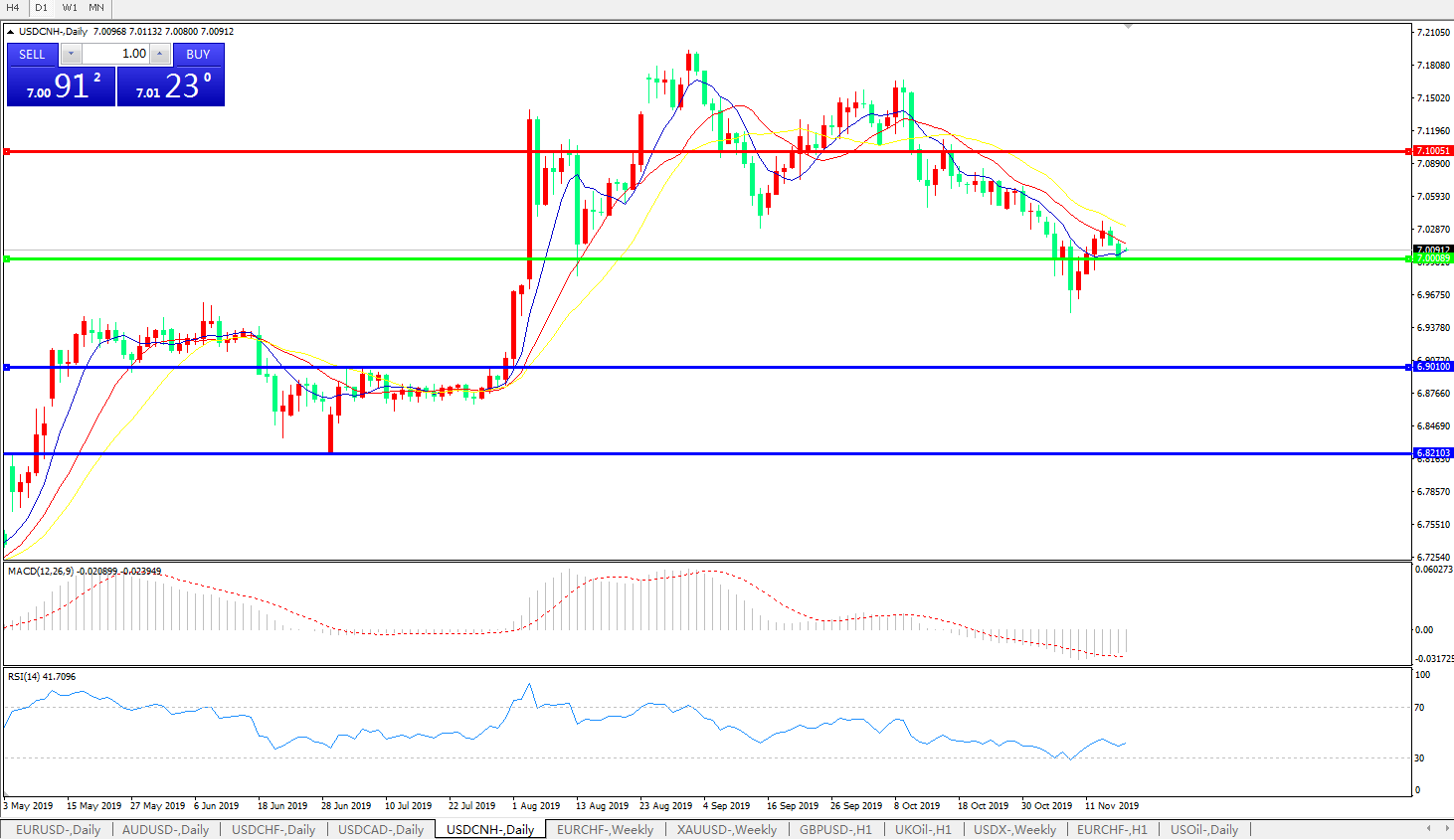 技术面简析:日图均线呈空头排列但短期均线拐头迹象明显,汇价7.0关口附近窄幅整理,MACD运行于0轴下方且量能微收缩,RSI有反弹走升迹象,预计短期汇价将在7.0关口附近整理,中期汇价需等待美元指数及中美贸易谈判进展指引。